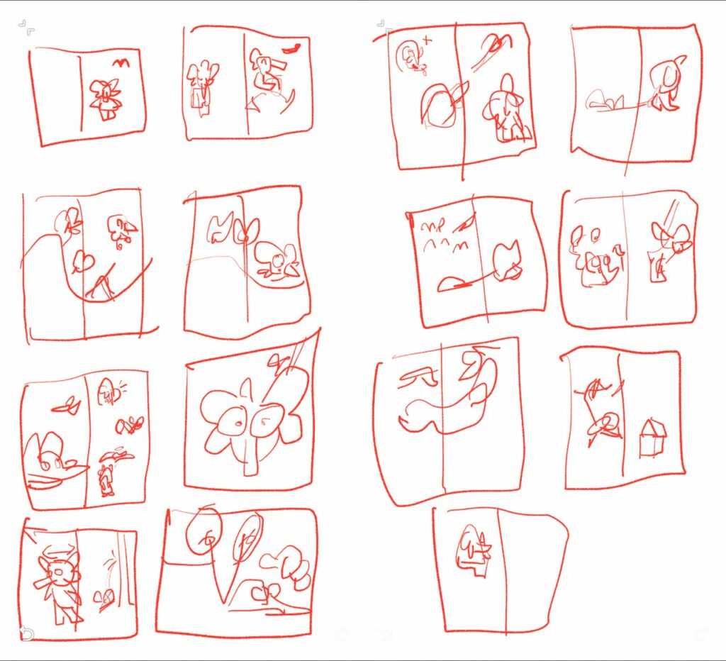 Nachdem die Geschichte stand konnte ich mit dem Ausarbeiten beginnen. Da ich sehr gerne und viel zeichne war das der angenehmste Teil im ganzen Prozess. Hier ein GIF um den Prozess zu zeigen. Entstanden sind die Illustrationen mit dem iPad und der App ProCreate. Mit Hilfe von InDesign habe ich dann später die DruckPDFs erstellt. Den Text habe ich ins Lektorat gegeben, das kann ich nur empfehlen – auch wenn Ihr eure Texte selber schreibt.