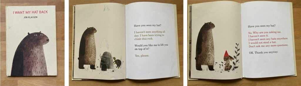 Das Buch ist super witzig. Ein Bär vermisst seinen Hut und fragt verschiedene Tiere ob Sie seinen Hut gesehen haben. Niemand will seinen Hut gesehen haben – aber wie sich herausstellt ist unter den befragten ein Lügner! Uneingeschränkte Kaufempfehlung. (Wie für alle Bücher die ich hier vorstelle).