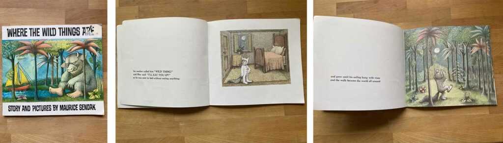 Als ich das Buch jetzt wieder neu entdeckt habe ist mir aufgefallen, wie genial Maurice Sendak mit dem Layout gespielt hat, während sich Max Kinderzimmer in einen Wald verwandelt wird der Bildausschnitt immer größer – stark!
